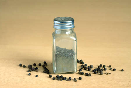 Peppercorn powder in glass condiment shaker over wooden background