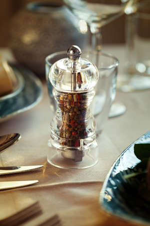 Close-Up view of pepper shaker On Table on light gray wall background. Space for text. Cooking concepts.
