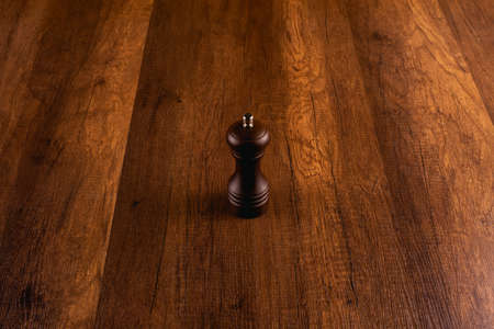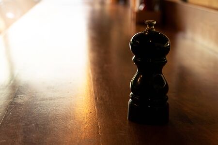 Pepper mill on wooden table under warm light background