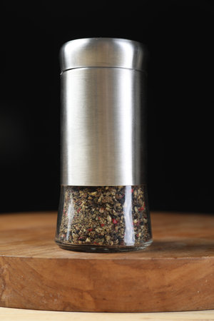 Pepper in glass shaker on wooden table at restaurant. Powder food ingredient cookery. Black seasoning spice.