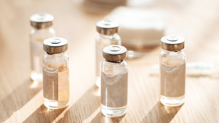 Macro photography of glass vials for liquid samples and vaccines. Shallow depth of field.