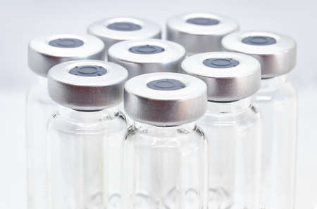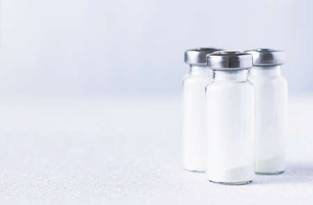 Medical glass vials for injection on a white background. Medicines and treatment of diseases, disease prevention. Pharmacology and Science. Copy space.
