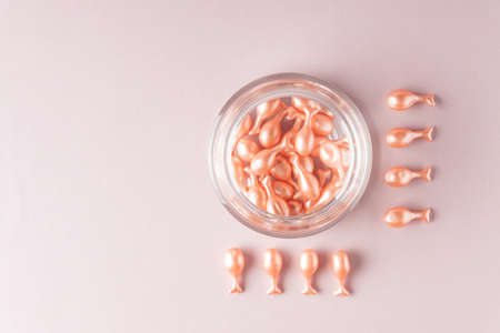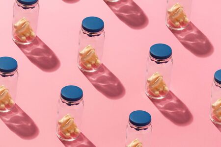 Ampoule with medicine, medicinal mixture and white jar of pills on pink background.
