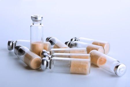 Vials, ampoules with dry probiotic, bifidobacteria, with probiotic powder inside on a white background. Copy space.