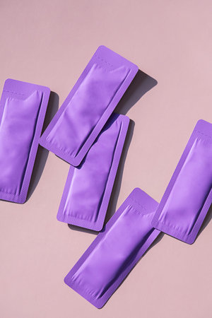Purple sachets for cosmetic product. Minimalist aesthetic for skincare and health supplements. Abstract and modern packaging mockup.
