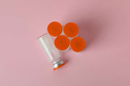 Vials of powder vaccine on pink background