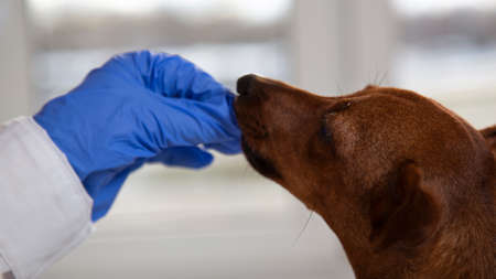 Vet doctor gives medicine to the pet. Close-up. Concept: veterinary clinic, help and care for the animals, the treatment of the dog