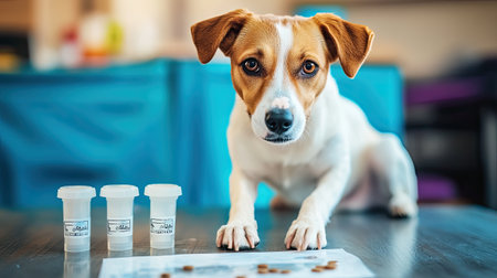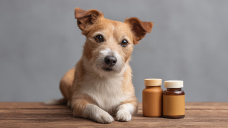 A charming dog poses beside health supplements on a wooden table, highlighting the importance of pet wellness and nutrition in a serene indoor ambiance.
