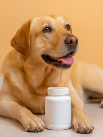 Happy Labrador retriever rests next to a white container of pet supplements on a soft surface, showcasing a warm and inviting atmosphere
