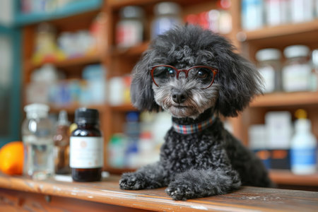 A black poodle wearing glasses sits on a wooden counter in front of a shelf of bottles. The dog appears to be looking at the camera, possibly curious about the contents of the bottles