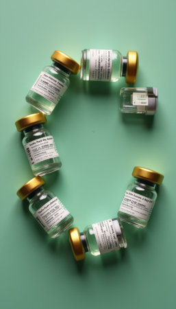Circle of vaccine vials on a mint green background