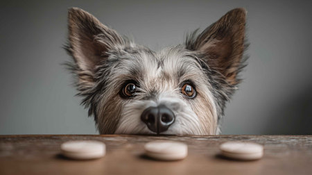 A gray puppy with striking blue eyes rests its head on a table scattered with white pills. The image conveys feelings of curiosity, innocence, and health concern.