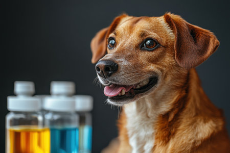 A friendly dog sits happily next to vials filled with yellow and blue liquids on a dark background.