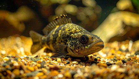 A detailed close-up captures a small, camouflaged freshwater fish resting peacefully on the colorful gravel of its aquarium home. The warm light highlights its intricate patterns and textures, offering an intimate glimpse into the serene and hidden world of aquatic life.