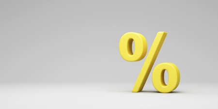 Yellow percent symbol on white background. 3D rendered illustration with bokeh.