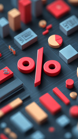 Red percentage symbol and financial icons on dark grid conveying discount data and analysis upbeat
