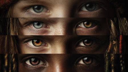 This image presents a close-up composition featuring various sets of human eyes arranged in horizontal rows. The eyes display a spectrum of colors and distinct expressions, set against a dark background. This could be useful for projects related to diversity, beauty, or human experience, and suitable for commercial applications.
