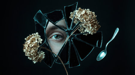 Eye peers through shattered glass fragments with dried hydrangea blooms and a metal spoon on a dark backdrop, leaving visible copyspace and negative space for text or design in editorial and conceptual projects