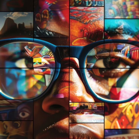 Colorful and intricate digital artwork showing the world through reflective glasses, embracing vibrant hues and detailed textures. Generated A.I.
