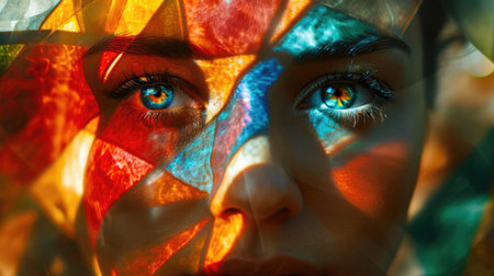 Creative portrait of a girl through a kaleidoscope or stained glass window. Surreal refraction, multifaceted, bright, colorful reflection on the face