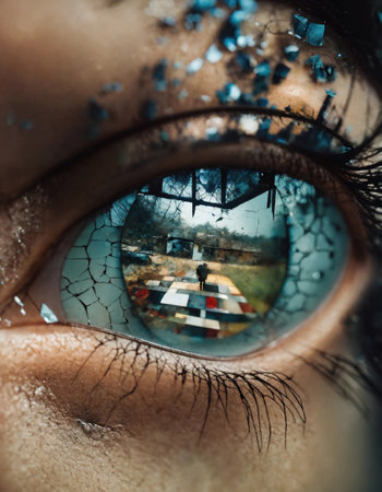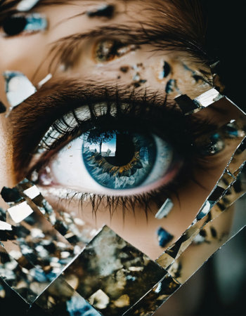 Close up shot of a beautiful woman's eye through broken glass.