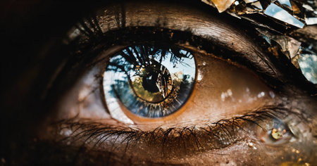 Close up shot of a beautiful woman's eye through broken glass. ai generative.