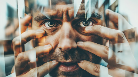 A thought-provoking portrait of a man peering through a fragmented image, symbolizing perception and introspection.