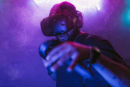 Back view close up of professional gamer playing online video game with his gameset. Room lit in neon light and retro style. Using headphones to talk with the team. Entertainment, fun concept.