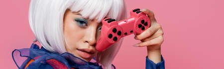 Asian pop art woman in white wig holding joystick isolated on pink, banner
