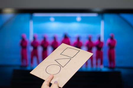 Moscow, Russia - October, 19, 2021. Outstretched hand with a card with the logo of the Netflix series Squid game on the background of a TV screen with a movie intro.