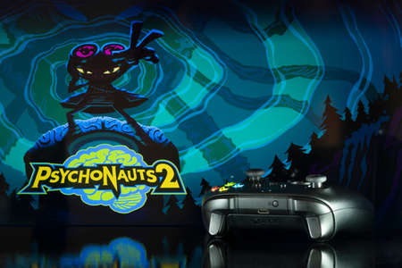 Psychonauts 2 game on tv screen with Xbox controller, 24th Aug, 2021, Sao Paulo, Brazil