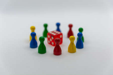 Different colors and shapes of pawn pieces and dices from board games, on a wooden background.