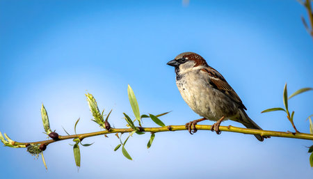 Sparrow sits on a branch with green leaves against a blue sky