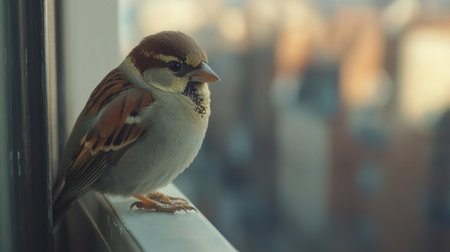 Close-up of a sparrow perched on a window ledge, creating a gentle, peaceful moment between nature and home