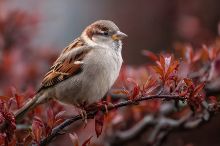 Sparrow perched on a branch surrounded by vibrant red leaves in a garden during early morning light