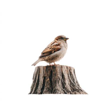 This image captures a small bird standing on a tree stump, showcasing its intricate feathers and subtle colors. The plain white background emphasizes the beauty of nature.