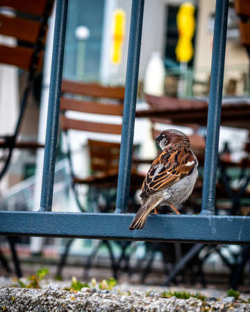 Closeup of a sparrow on the chairs of a restaurant closed due to the coronavirus epidemic that is hitting France