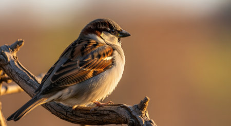 A small sparrow perches on a dry tree branch, illuminated by the warm, golden light of sunset. The blurred background highlights the bird's detailed brown and white feathers and alert expression, capturing a peaceful moment in nature.
