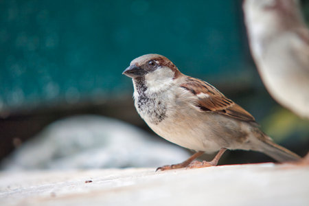 Small brown and gray bird, a house sparrow, perching on a white ledge with a blurred turquoise background in the dominican republic