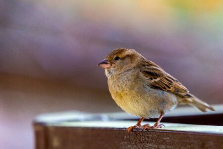 Sparrow bird sitting on the fence, blurred background. Sparrow wildlife.