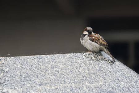 small brown sparrow in the city sits on a concrete wall