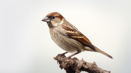 A sparrow sits perched on a slender branch, captured with detailed photography. The bird displays brown, beige, and black plumage against a blurred, soft-focus backdrop. The composition highlights the bird's form, suggesting a natural outdoor setting with subtle lighting, suitable for various editorial and commercial applications.