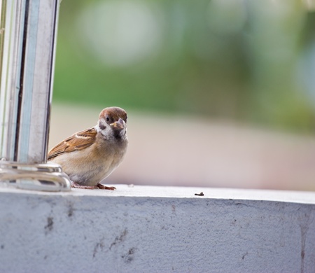 A little bird sits on the windowsill and looks out the window