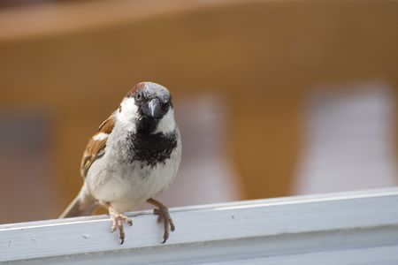 Male house sparrow standing on wooden table in New Zealand