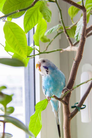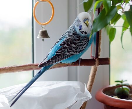 Funny blue budgie. Budgerigar at home on light background. Copy space.