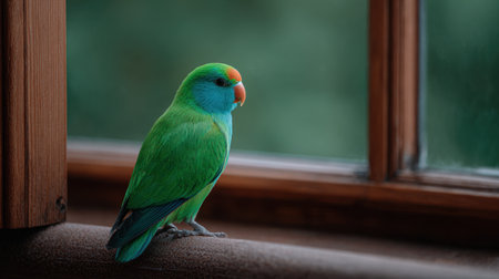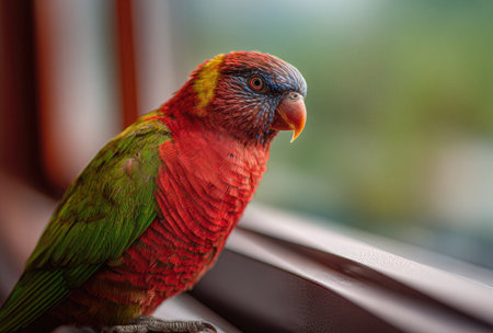A vibrant parrot with red, green, and yellow plumage is perched near a window. The bird is the focal point, set against a blurred green backdrop suggesting an outdoor environment. This image showcases rich colors and textures, suitable for various uses including editorial and commercial projects.