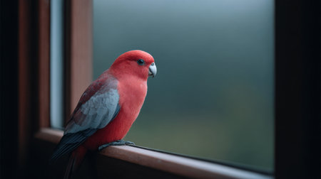A stunning close-up of a vibrant scarlet bird perched by a window, showcasing its colorful feathers against a soft, blurred background.