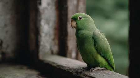 A vivid green parrot rests gracefully on a rustic wooden ledge, surrounded by a soft-focused natural backdrop. This image captures the bird's intricate feathers and serene demeanor, offering a glimpse into its tranquil habitat. Perfect for wildlife enthusiasts or nature lovers.