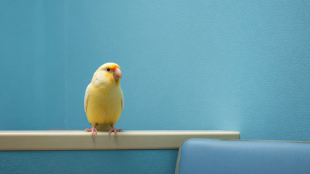 A bright yellow bird sits on a clean perch in a veterinary office, surrounded by a soothing blue backdrop, ready for a check-up or care.