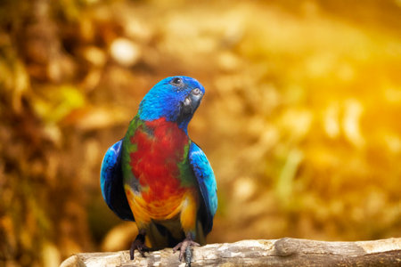 The Scarlet-chested Parrot is a small, brightly colored parrot. The male has a scarlet chest, both sexes have a cobalt blue head and deep yellow underbody